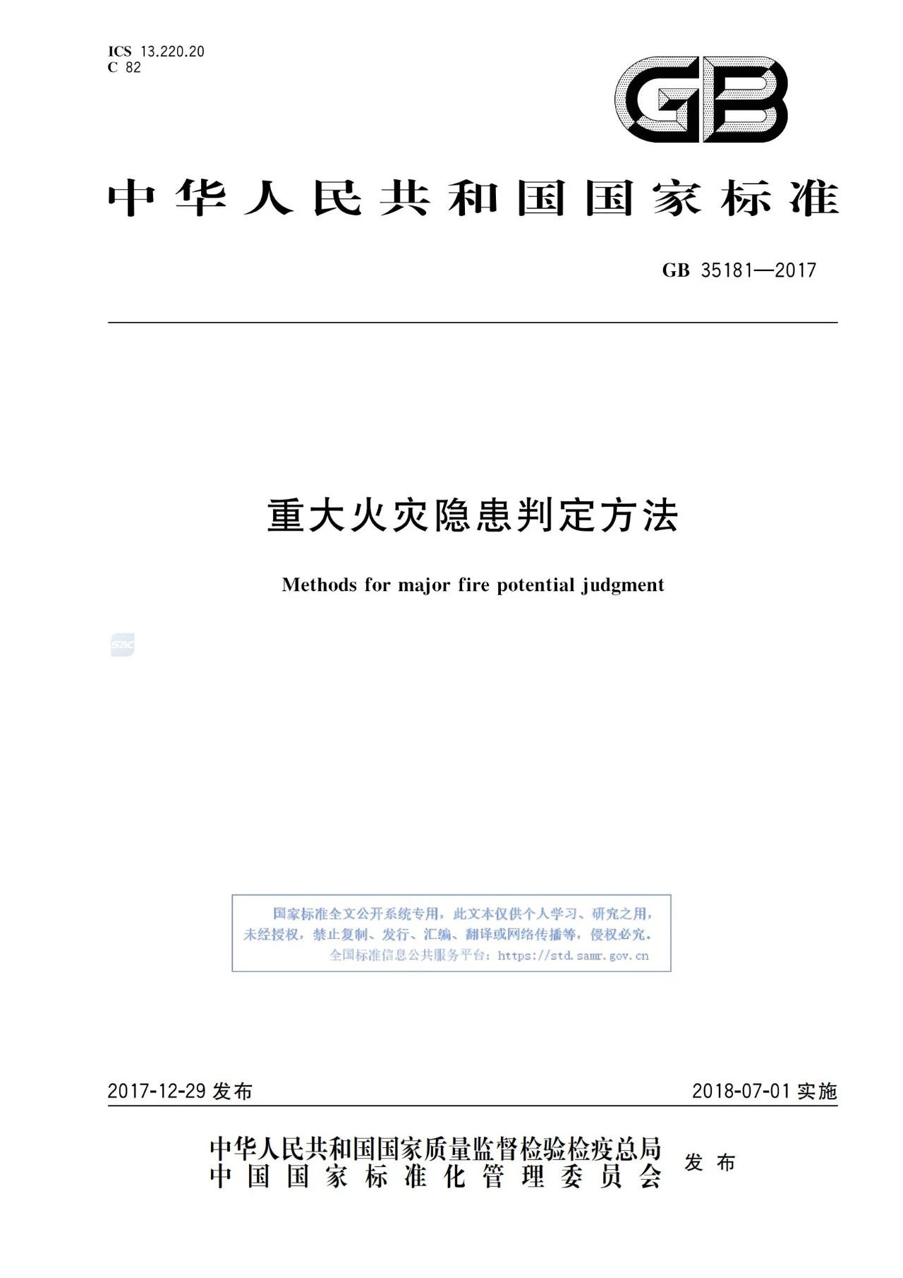 本标准规定了重大火灾隐患的术语和定义、判定原则和程序、判定方法、直接判定要素和综合判定要素等。重大火灾隐患为违反消防法律法规、不符合消防技术标准,可能导致火灾发生或火灾危害增大,并由此可能造成重大、特别重大火灾事故或严重社会影响的各类潜在不安全因素。